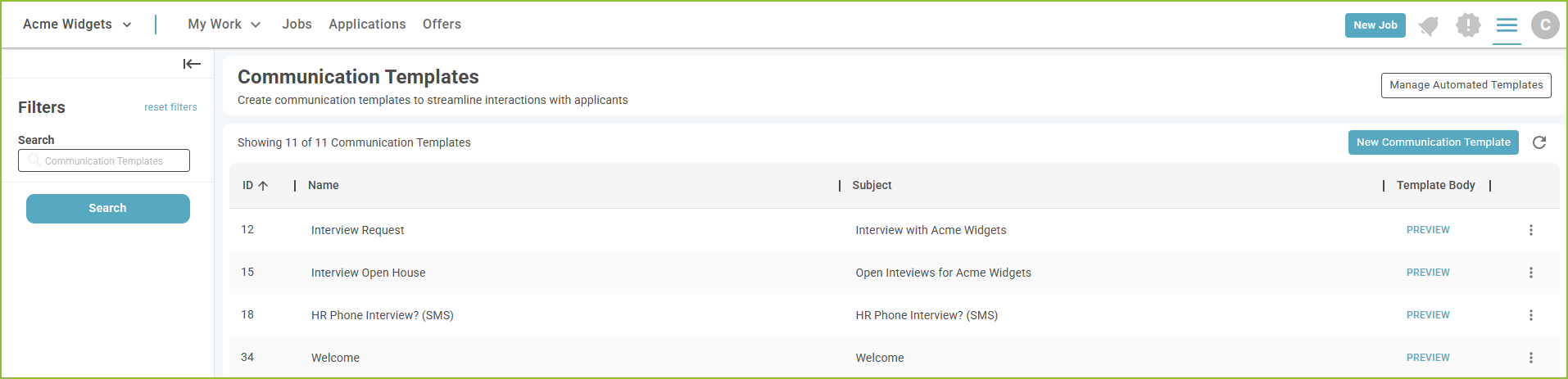 - Use the search bar to locate specific Communication Templates quickly.