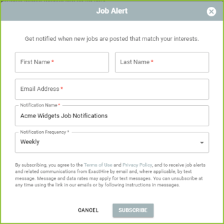 Job Alerts allow applicants to subscribe to receive email notifications when new opportunities are posted on the career site.