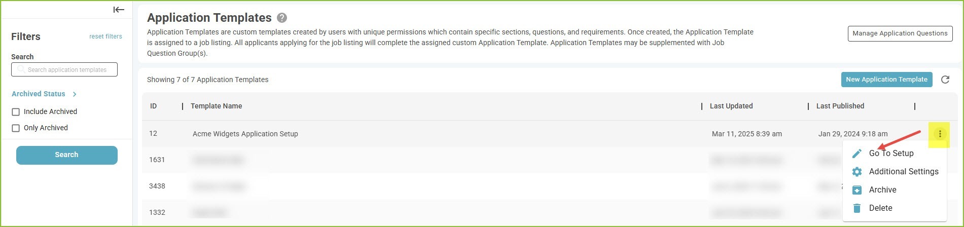 - To edit an existing Application Template, click the More Options icon on the far right.