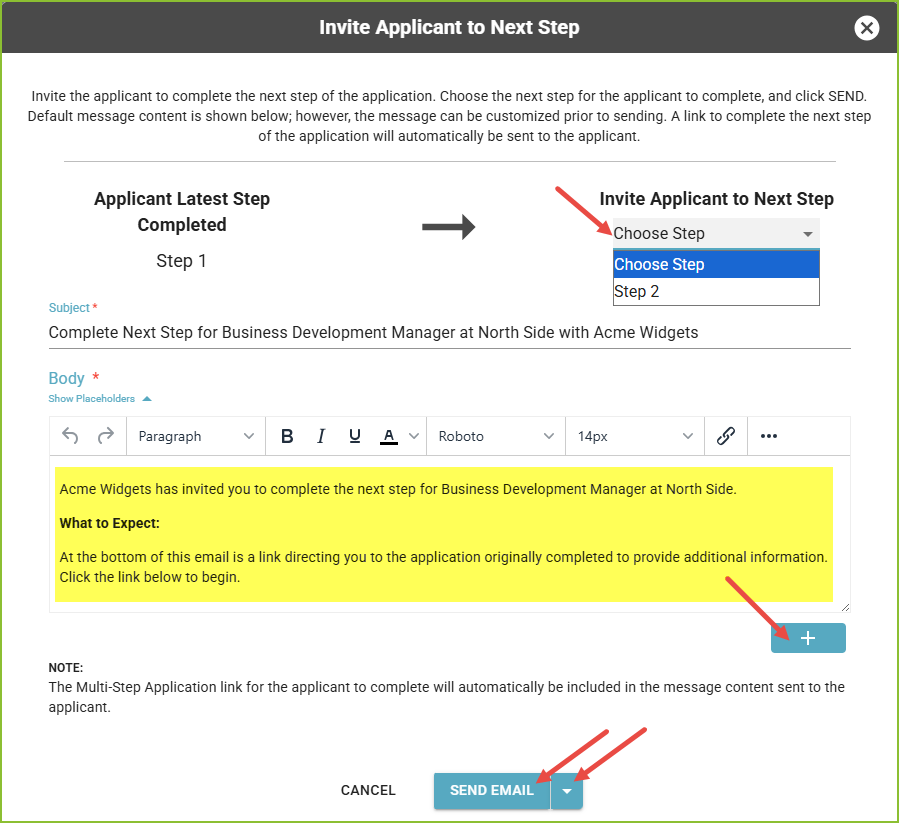 - On the Invite Applicant to Next Step screen select the step the applicant should be invited to complete.
