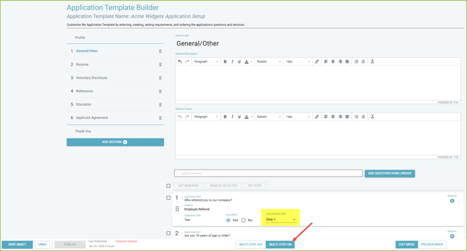 - Once the Multi-Step Application has been turned on, a new selection option will be visible in connection to every question field. Select either Step 1 or Step 2 to control when the question will be visible to the applicant during the application process.