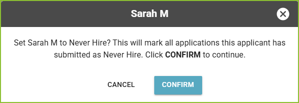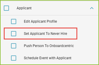 • Users must have the Set Applicant to Never Hire role permission to utilize this feature.