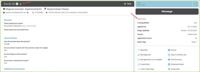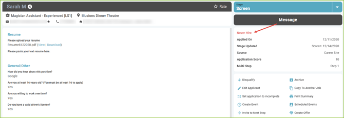 • In the Application Details, a user may assign the label of Never Hire to the applicant.