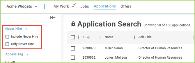 • Never Hire applicants are hidden on the user's default APPLICATIONS view. Use the filters to include applicants with the Never Hire label.