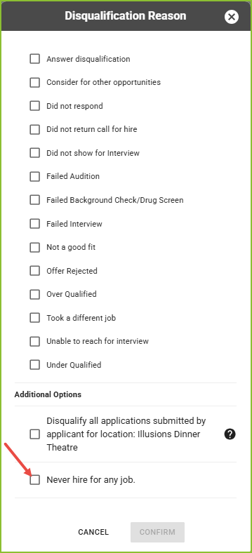 • Additionally, choose to Disqualify all applications submitted by the applicant for the specified location and/or Never hire for any job.