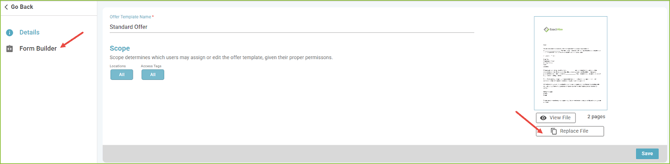 - Please note, after the Form Builder has been customized and published the PDF document can no longer be replaced. A new Offer Template would need to be created.