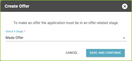 - PLEASE NOTE: The Application Stage for the applicant must be in a Made Offer stage in order to initiate the Offer workflow. If the Application Stage is not in a Made Offer stage, the user will be prompted to change the Application Stage.