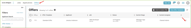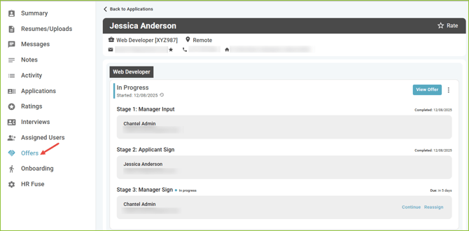 Users can monitor the progress of the Offer on the Offers tab of the Applicant Record and in the OFFERS area.