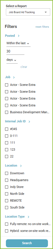 - Adjust the filters to control the Posted Date Range, Job, Internal Job ID, Location, Location Type, Job Board, and Job Archived Status.