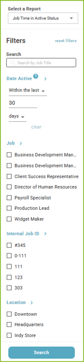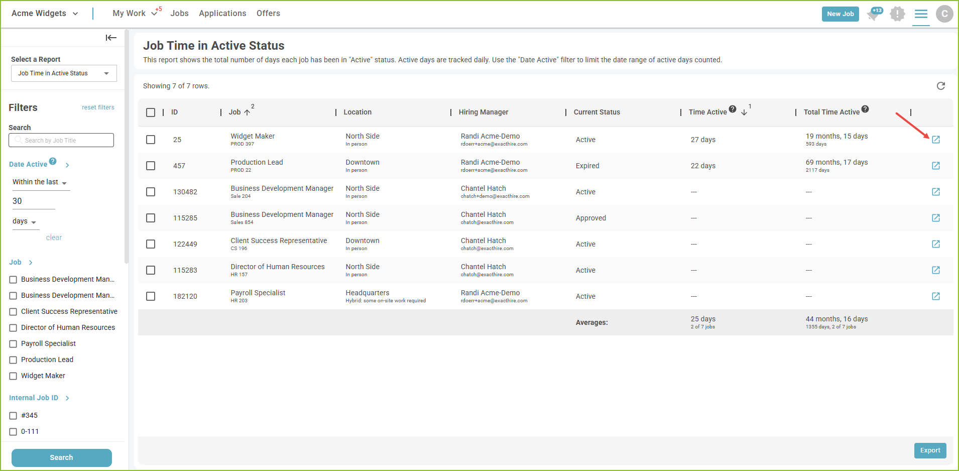 - Adjust the filters to control the results according to Date Active, Job Title, Internal Job ID, Location, Location Type, Hiring Manager, and Job Archived Status.